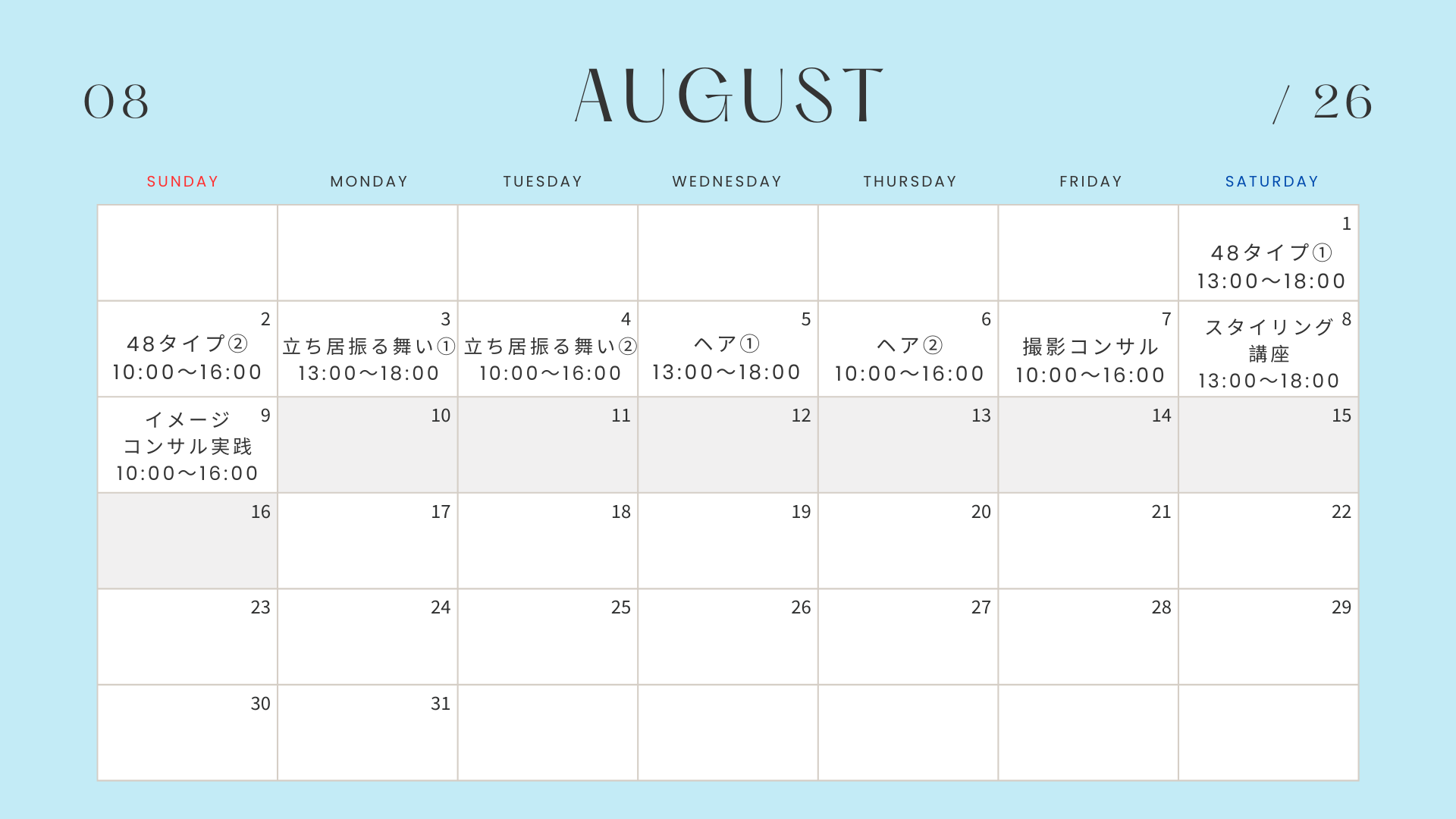 ⑤7月31日(金)10:00~16:00(コスメカラーアドバイザー養成講座)
